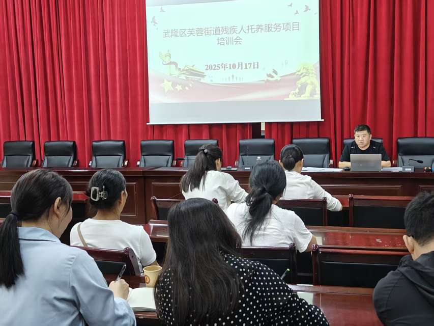 10月17日下午2点,由重庆市武隆区飞花健康咨询有限责任公司承接、实施的武隆区芙蓉街道《残疾人托养服务(2025年度)》项目培训会在芙蓉中路社区会议室召开。飞花健康公司负责人肖强兵在培训会中,主要围绕项目背景、服务内容、服务方式、服务人员分布、服务次数、服务质量、服务时间、专业社工+志愿服务等进行了讲解。会议采取线下培训与线上腾讯会议方式同步进行,来自飞花健康公司人员、志愿者代表、社区代表共计15人参会,项目将于18日正式实施。