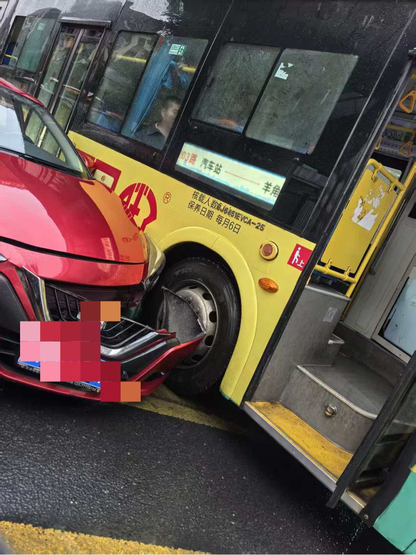 下雨天出行开车慢点,都市广场小轿车与公交车挨上了,慢点,慢点