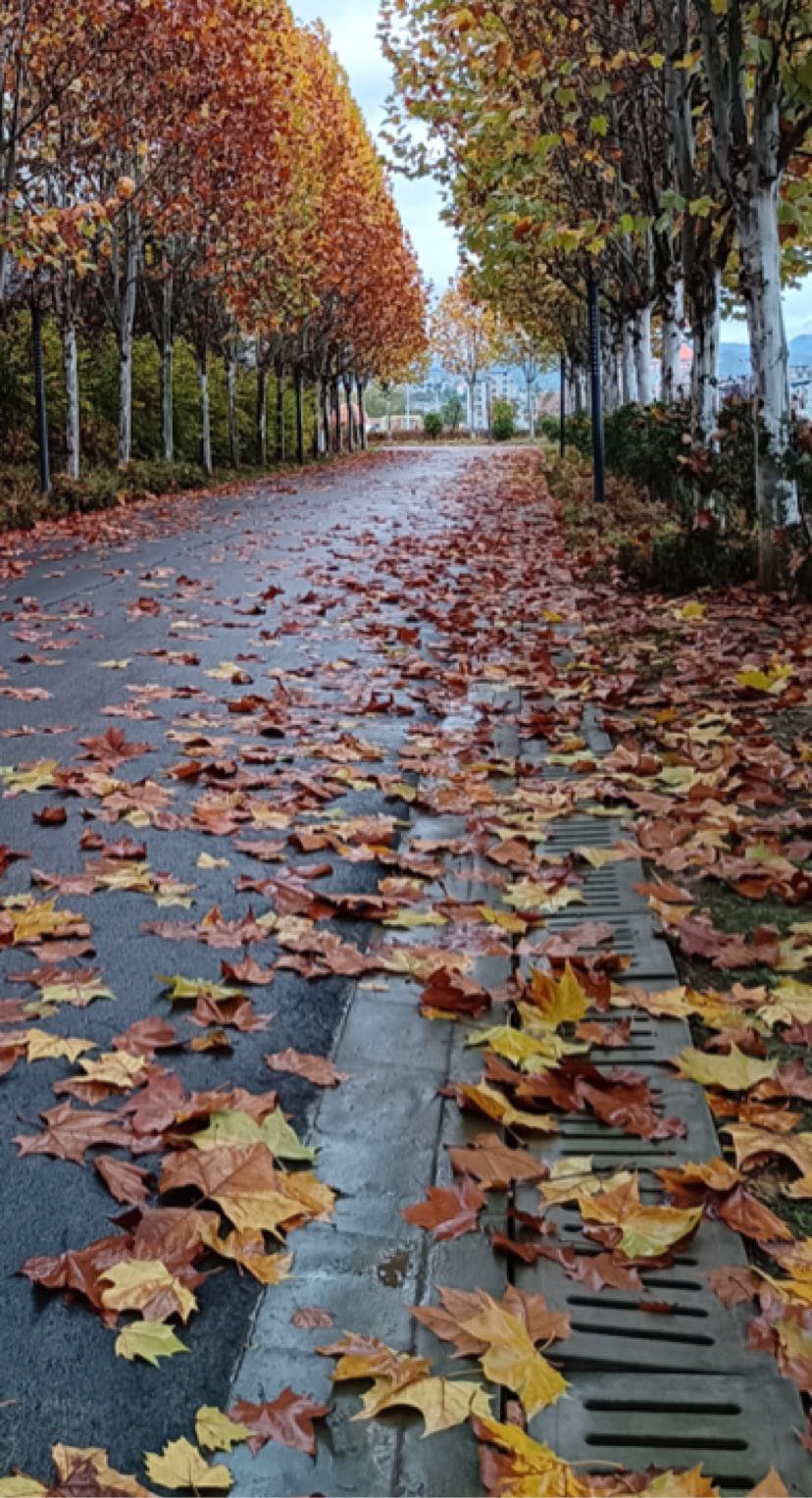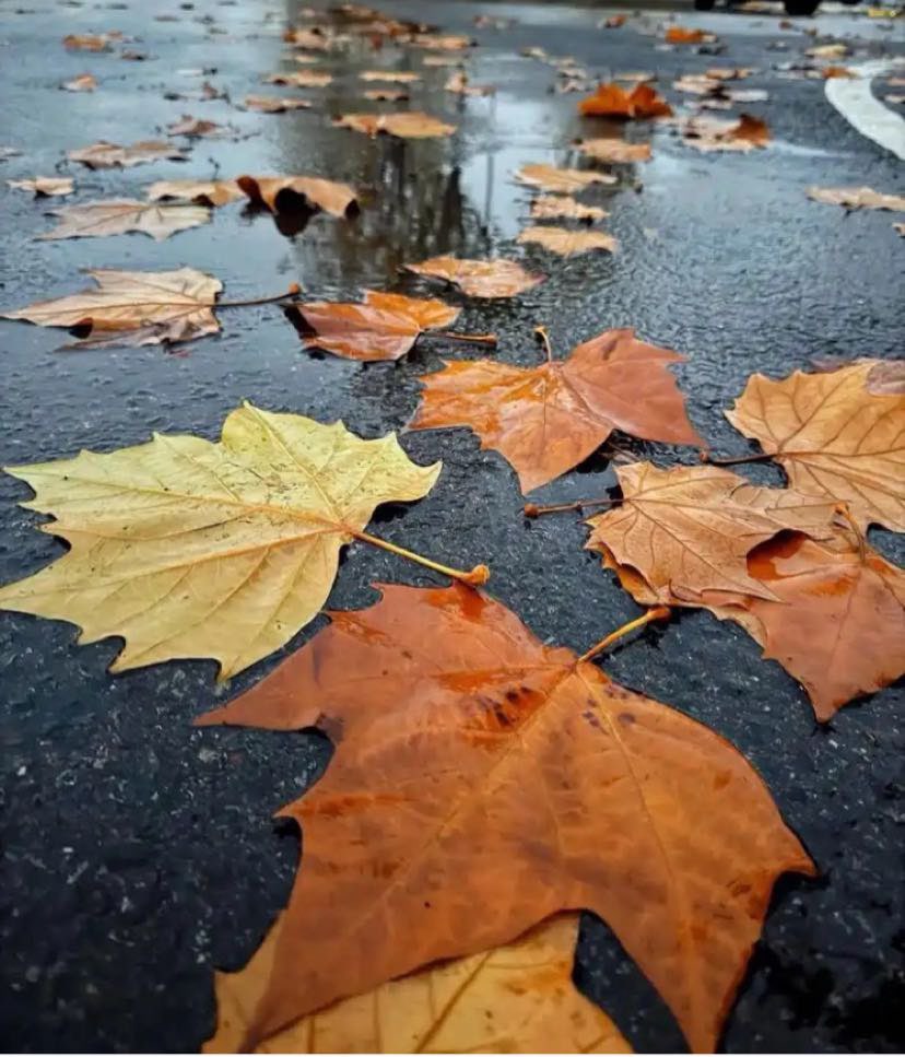 雨滴轻吻落叶,倒影中的树影在湿润的地面晕染成水墨画,雨后的风景被映衬,树梢触到落叶的倒影在彻夜畅谈,好美的画面