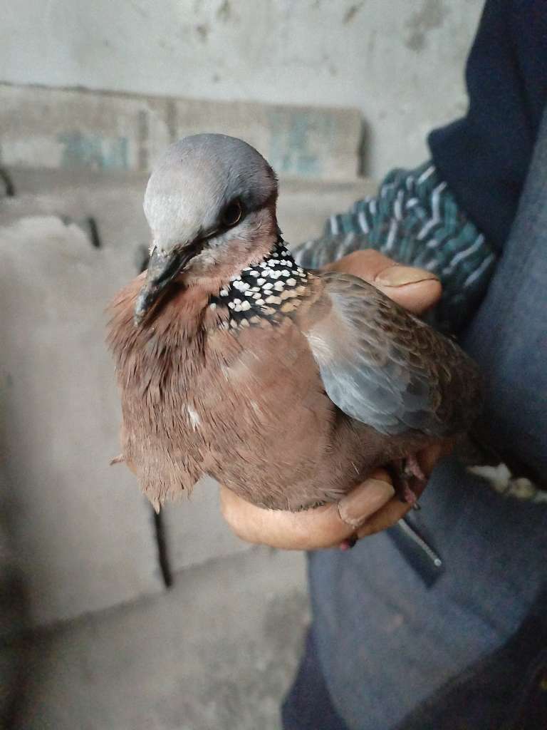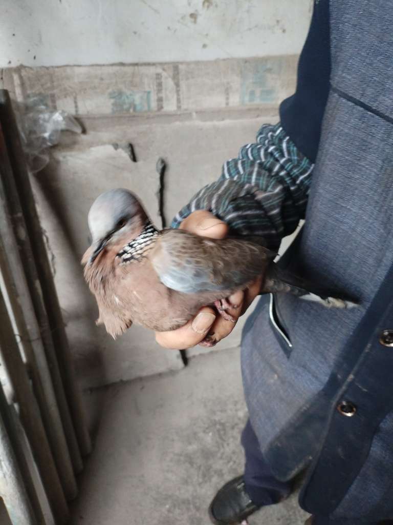一个大爷在外面捡个鸟,一直看见过这个鸟在外面飞,但是从来没有这么近距离看,听说是这个鸟受伤了,飞不起来。大爷要拿回去当鸡喂。看起这个鸟比家鸽子小些,我还是第一次近距离观察这个鸟。不知道人工喂养能喂活不?