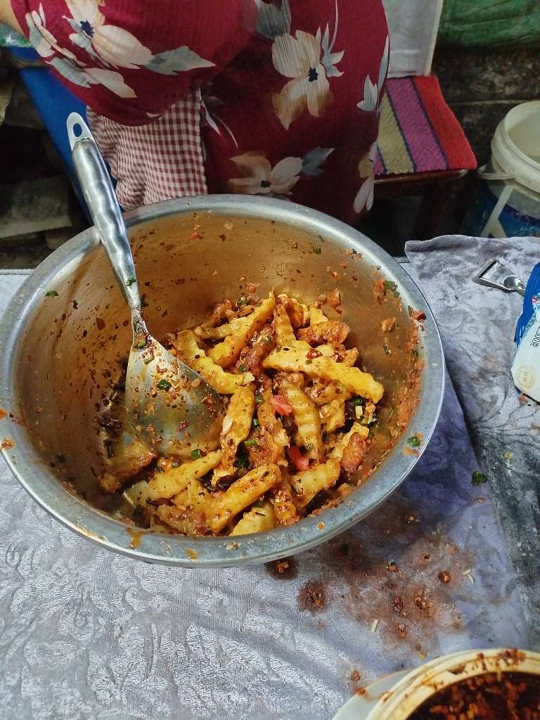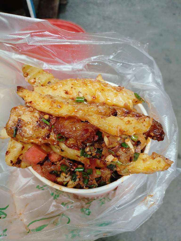 小时候放学,没什么吃的,就买学校门口的洋芋花,酸辣粉。那时候明明知道家里有饭,但还是要买。感觉好像不出来买点校门口的小吃,就没有读书的标配。其实现在想起,虽然当时便宜,其实很撇的给。初中毕业之后就再没怎么吃过这些。今突然想尝尝现在的洋芋花。买了一碗,价格五块。央央把佐料加起,特别是酸萝卜。感觉还可以。央央还特别给我多装了些。好久没有吃过这个洋芋花了。