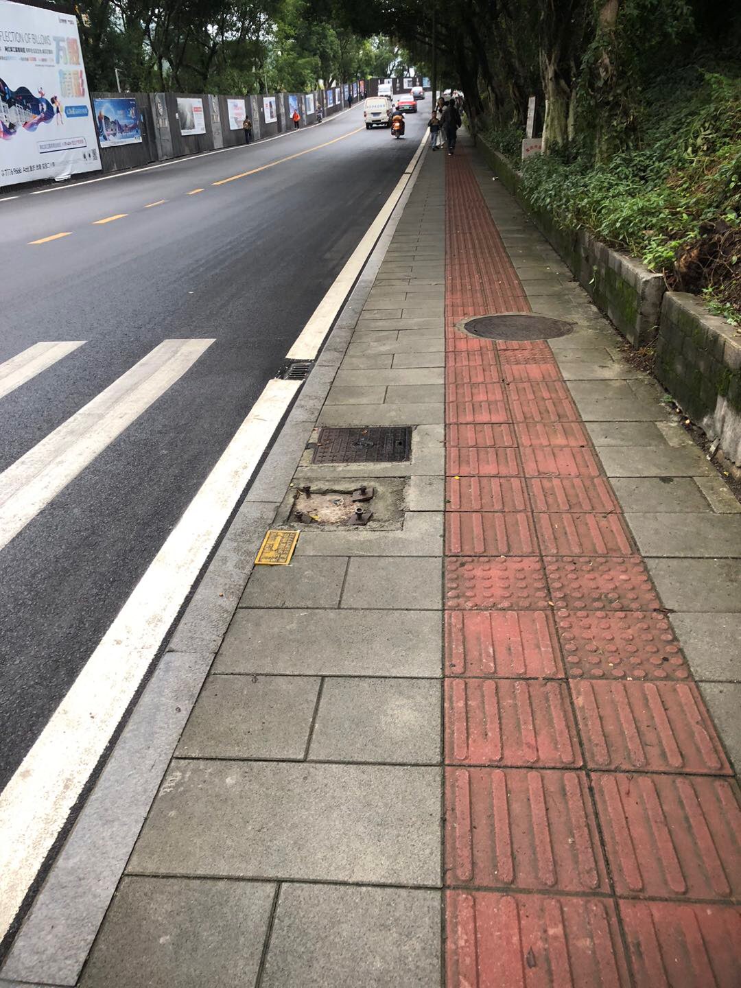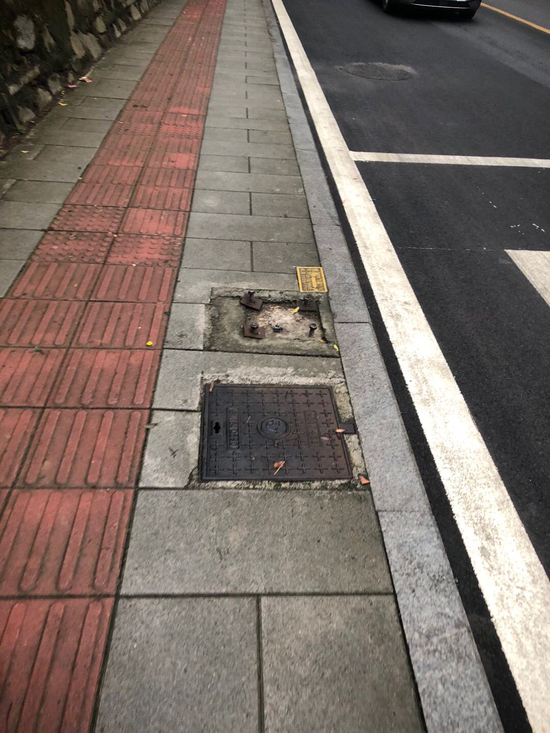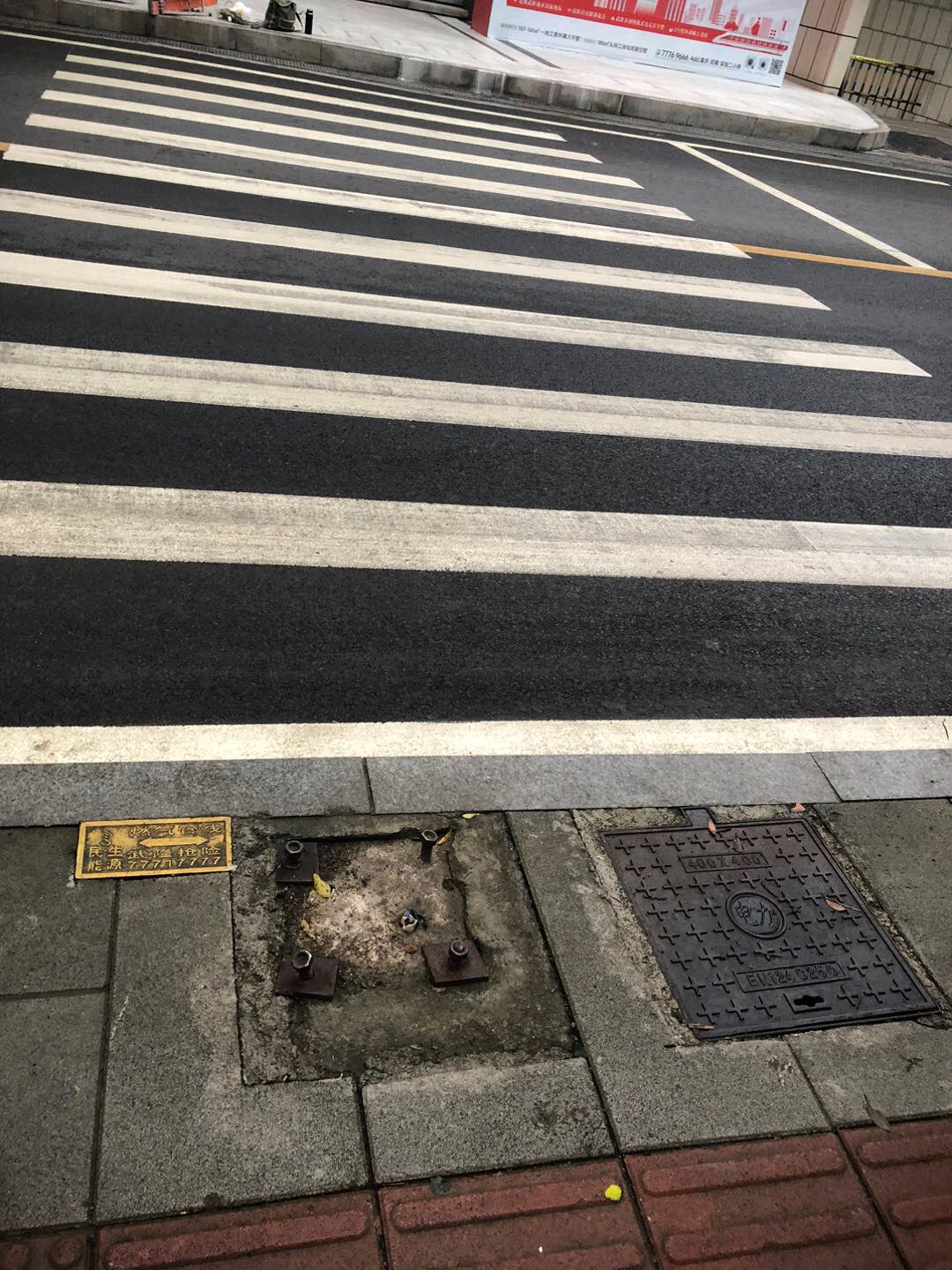 映江澜大门外面人行道对面路上这个电线杆应该是拆了,但是螺丝还在,容易摔跤。