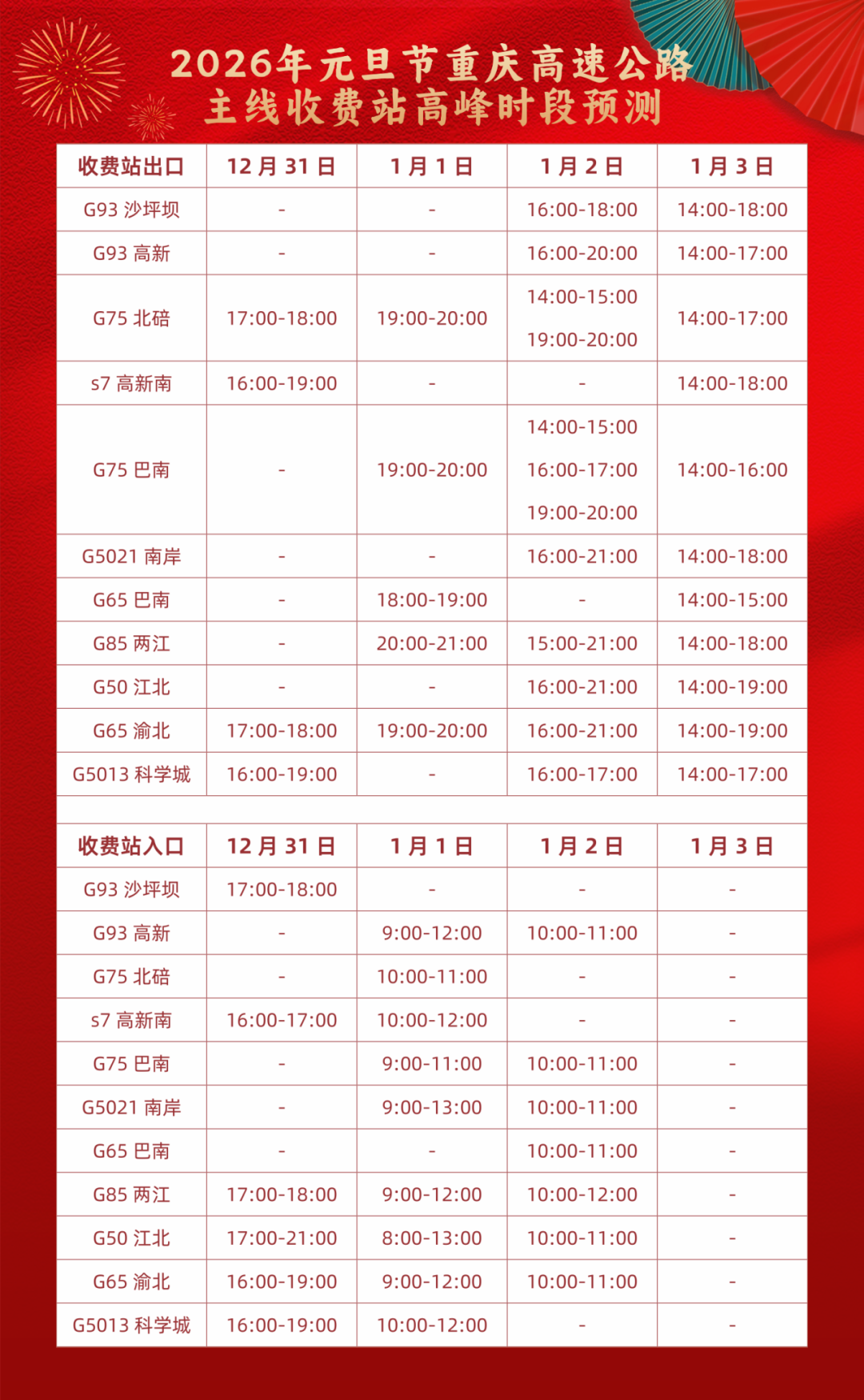 预计元旦假期车流量较大的收费站:G5013科学城、S7高新南、G93高新、G5021南岸、G65巴南、G93沙坪坝、双福北、G50江北、G75北碚、开州。
