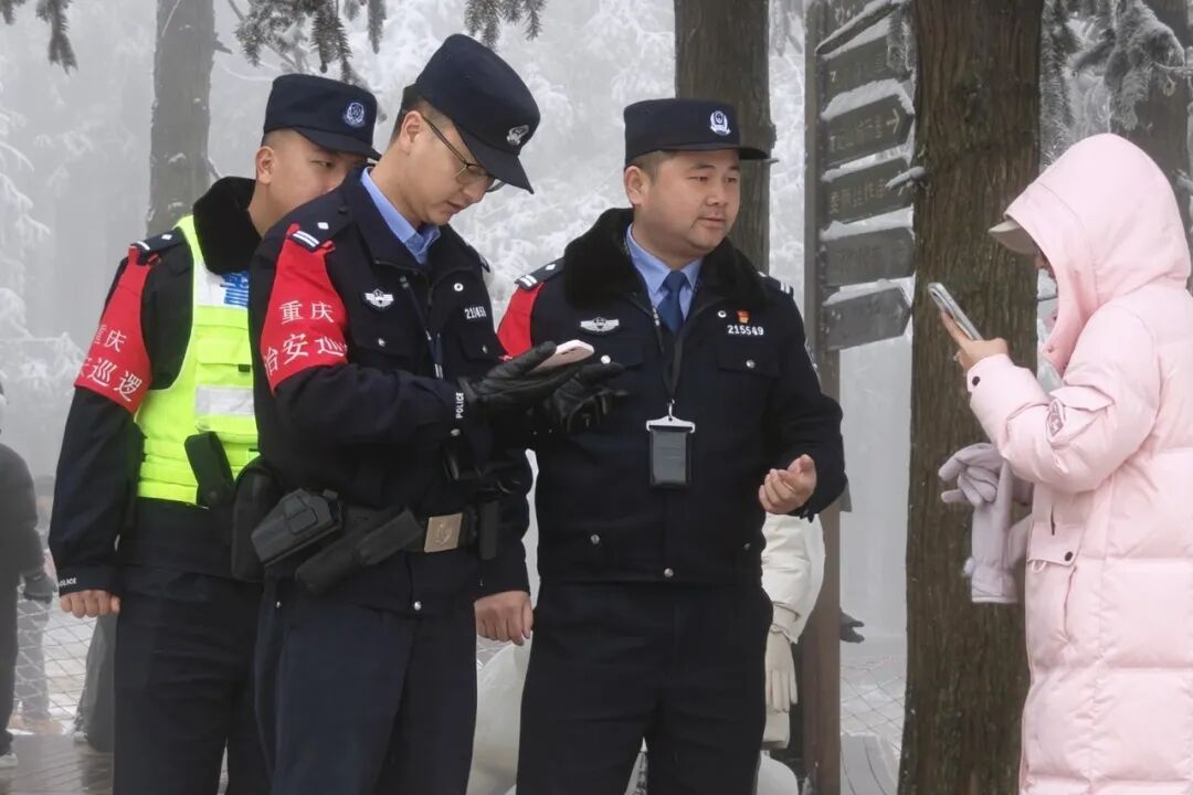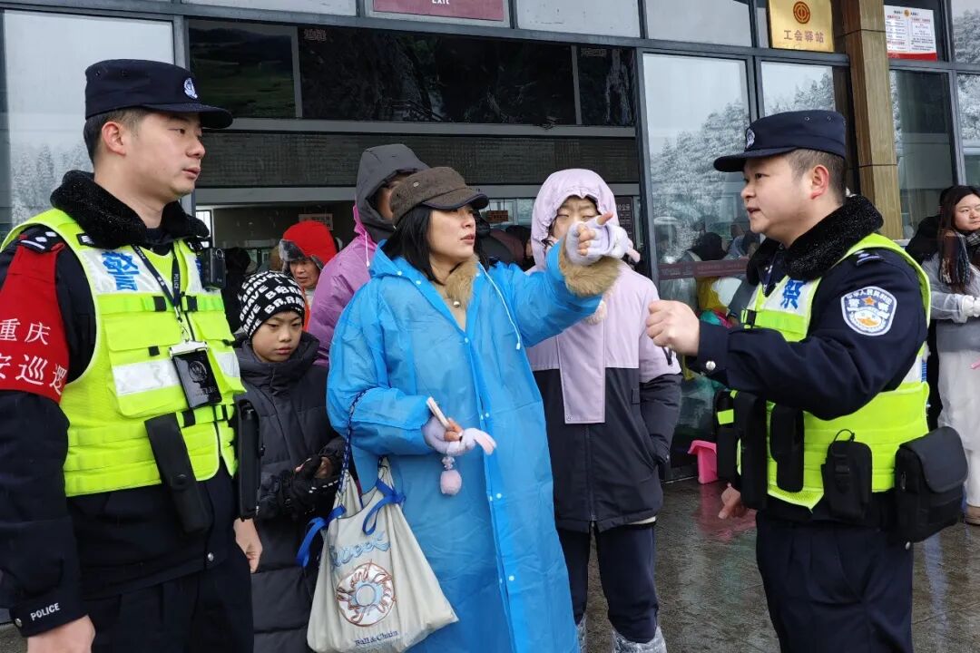执勤中,仙女山派出所始终把游客安危冷暖放在首位,主动为滞留游客送上热水、应急保暖物资,耐心解答路线咨询、返程指引等问题,贴心帮扶老弱病残孕游客至安全区域等候。风雪无情,警民有情,仙女山派出所民辅警用点滴暖心举动,化解游客旅途不便,为冰雪中的景区增添浓浓温情,生动践行“人民公安为人民”的初心使命。