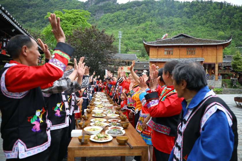 3.苗家长桌宴(3月3日 18:00-19:00)地点:红军食堂 / 民族文化广场(视天气而定)来宾同坐长桌宴,品尝融合当地风味的特色团圆餐。席间,热情好客的苗家儿女将唱着敬酒歌为您送上祝福,体验“高山流水”的酣畅淋漓。