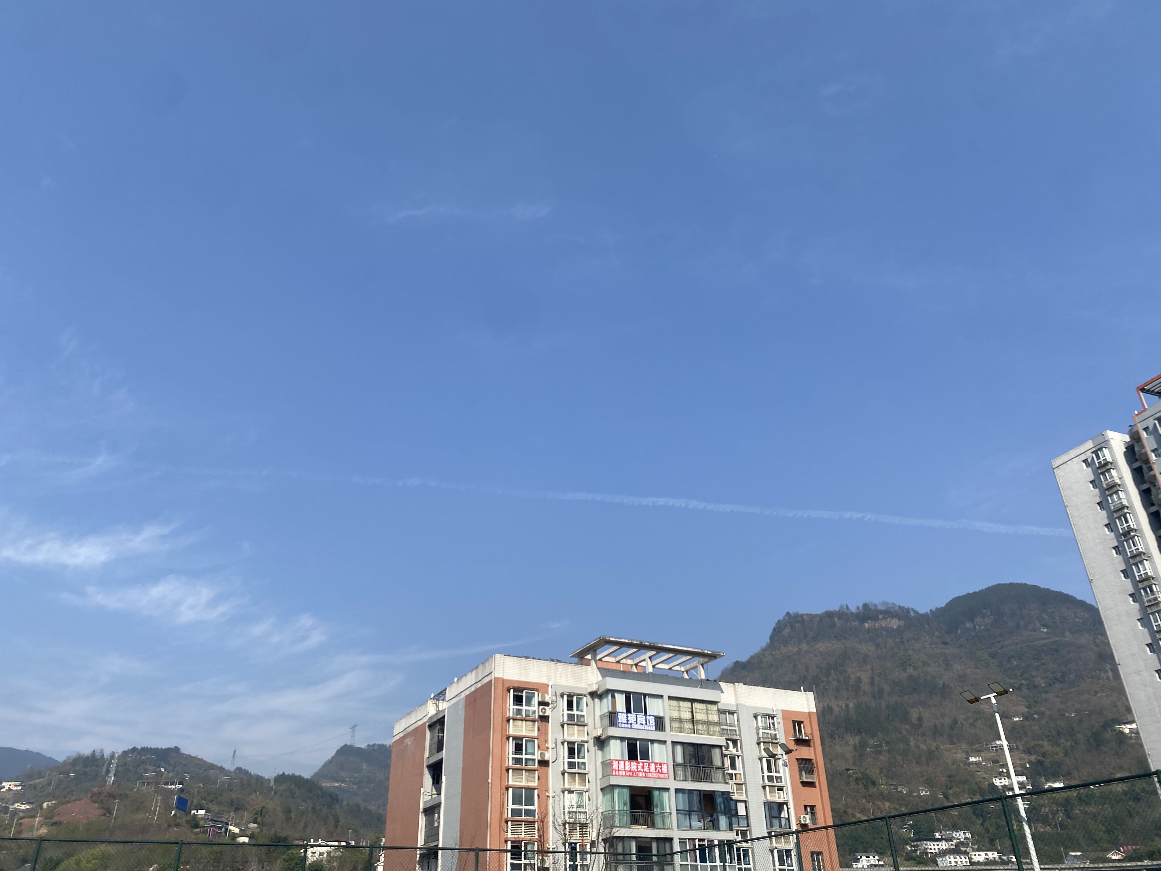 阳光明媚的天空中,一条白色的直线显得格外的耀眼,不知是怎么形成的,好独特