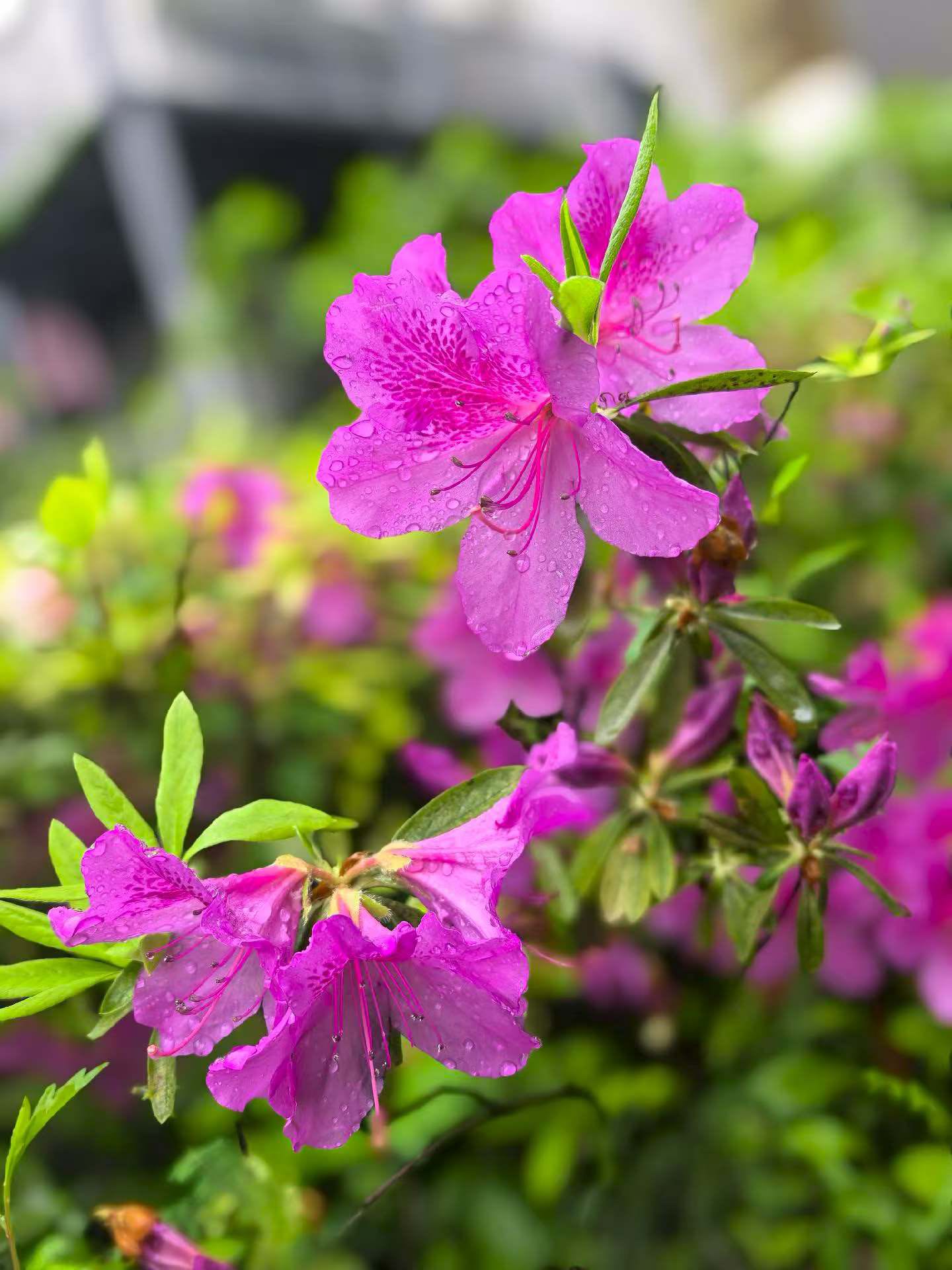 后花园内,繁花似锦,各种花卉争奇斗艳,雨滴晶莹剔透,营造出一派生机勃勃的景象,治愈了疲惫,饱了眼福。