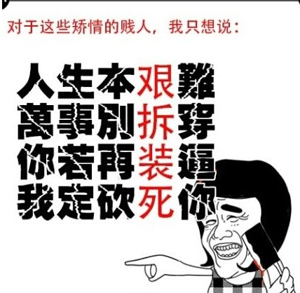 19、艰拆装死 网络新词,是“人生本艰难,万事别拆穿,你若再装逼,我定砍死你!”的缩写形式。 艰拆装死,多出现在百度贴吧、微博、论坛等公众社区平台,多为对楼主所发内容的不满。